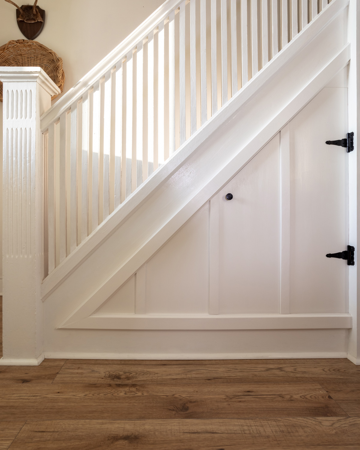 In our front hall, we tucked a semi-hidden storage cabinet under the stairs with built-in shelving inside to house the board games and puzzles we often like to use nearby. This custom solution would almost disappear into the woodwork if it weren’t for the beautiful decorative gate hinges we used.