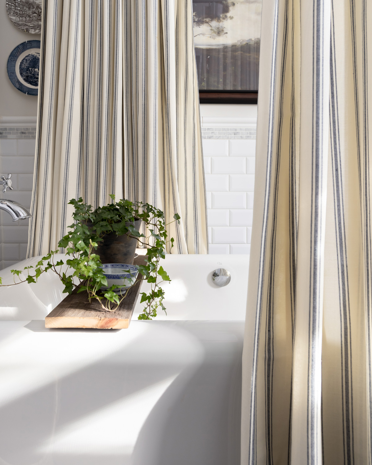 I’m so thankful for our beautiful freestanding tub that we added when we renovated our ensuite bathroom about ten years ago. It feels so good to know that making timeless choices in this space really paid off, because I still love everything we did in this space. I’ve always felt like the tub wasn’t quite getting the treatment it deserved with the standard shower curtains I’ve used in here, though, and I’ve finally figured out the perfect solution. Home really does take time! I recently added full-length custom ticking stripe curtains around the tub, and wow, what a difference they made. They bring such grace, elegance, and even a little bit of drama to this space and I’m still not over how impactful this change has been even though it was such a simple project to execute. This decorating trick isn’t just for stand alone tubs though! If you have a regular bath/shower combination, using custom curtains as a shower curtain can elevate your entire bathroom instantly. Here’s everything you need to know to make regular drapes work as a shower curtain.