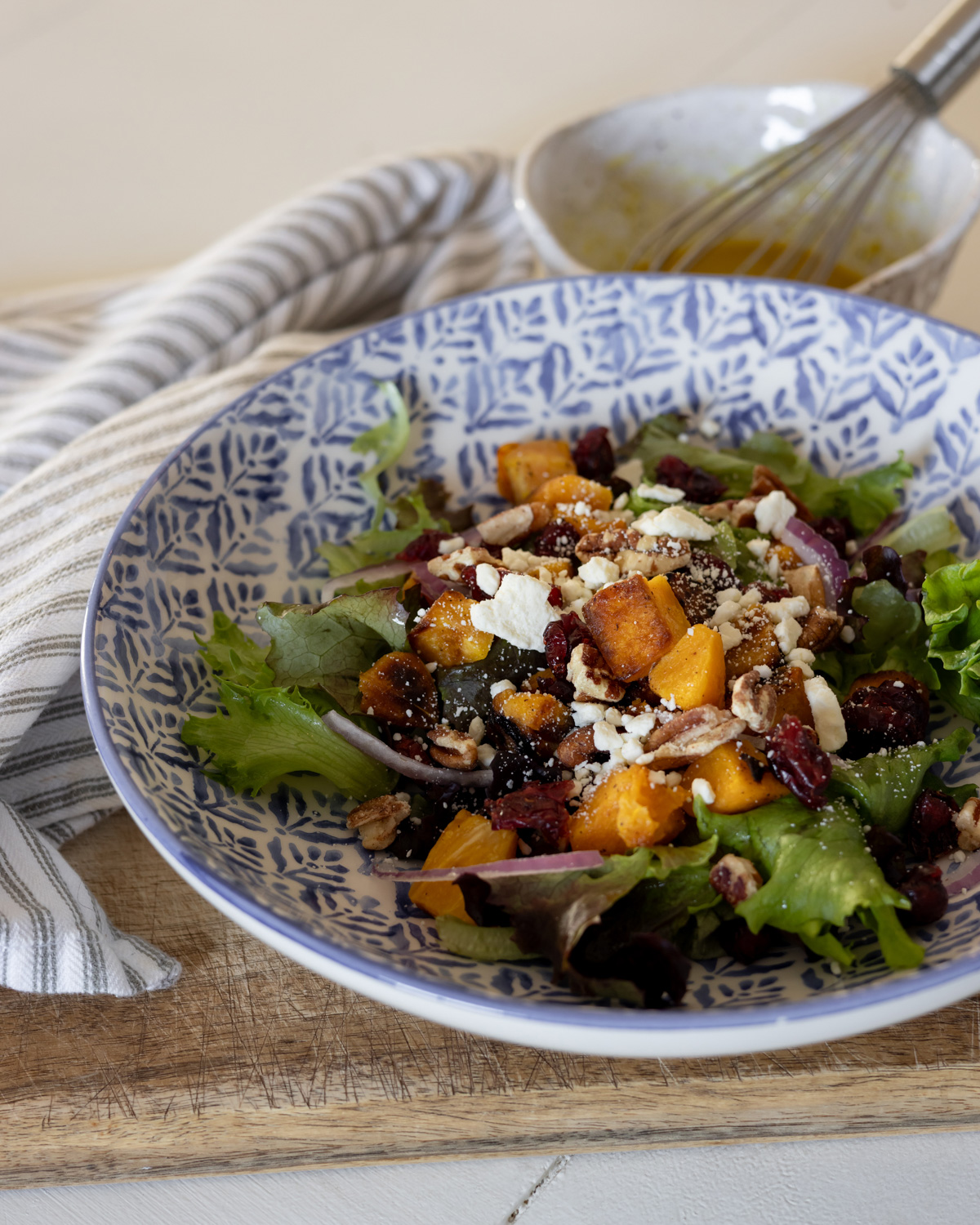 To assemble the salad, create a bed of baby lettuce on a plate or in a shallow bowl, then layer on the roasted squash, sliced red onion, pecans, dried cranberries, and feta cheese. Drizzle a few tablespoons of the dressing overtop and enjoy!